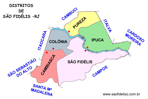 Em divisão territorial datada de 1-Vll-1960, o município de São Fidélis figura com 5 distritos: São Fidélis, Cambiasca ex-Ponte Nova , Colônia, Ipuca e Pureza.